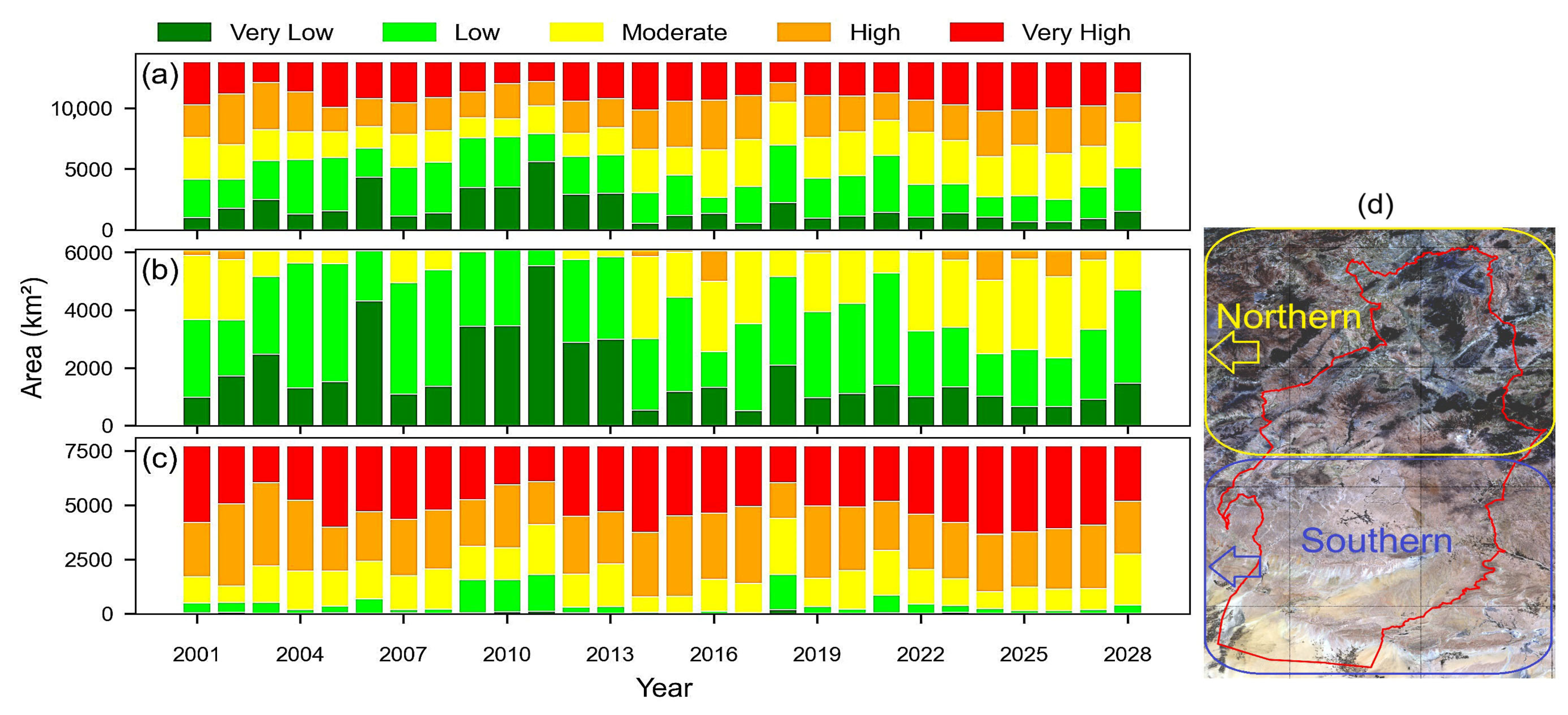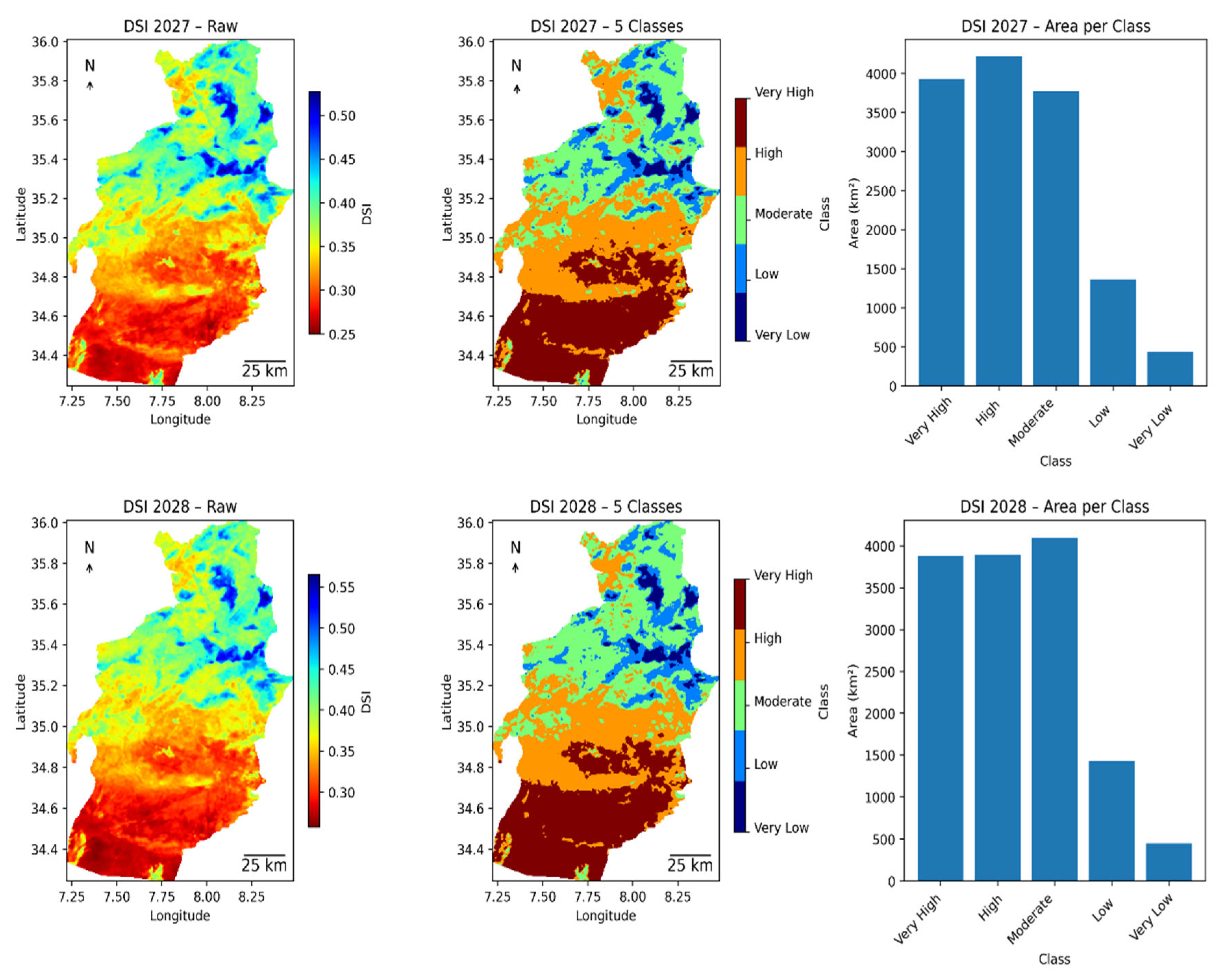 3.6. DSI Annual Trends and Spatial Distribution from 2001 to 2028