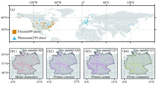 Distribution of ground observation sites from Fluxnet, PhenoCam (a), and PEP25 network (b1–b4).