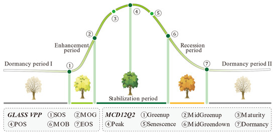 Conceptual illustration of the correspondence between phenology from MCD12Q2 and GLASS VPP.