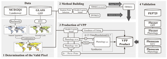Our objective is to generate the global VPP by integrating two independent methods based on the GLASS GPP product. To achieve this goal, we designed a framework composed of several steps (Figure 3). The detailed technical processes are introduced in the following sections.