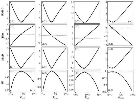 Based on the scheme depicted in Section 2.2.3, a sensitivity analysis was conducted to assess impact of varying Kp values on the consistency of phenology metrics derived from both methods. The results, presented in Figure 4 and Table 3, indicate that the optimal Kp values for SOS, MOG, EOS, and MOB are 9.5% (left), 48.8% (left), 8.8% (right), and 46.6% (right), respectively.