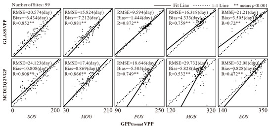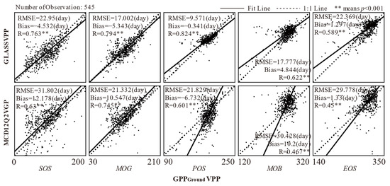 To mitigate the potential impact of unstable GPP measurements, attributable to environmental noise and interannual variability, on the validation results, we calculated multi-year mean ground phenology metrics (VPPGround) and corresponding satellite-derived phenology metrics from GLASS VPP and MCD12Q2 VGP for each site. This approach significantly enhanced the reliability of the validation process. Figure 6 presents the validation results for these five phenology metrics. The results demonstrate that both products exhibited improved accuracy, with GLASS VPP metrics consistently outperforming MCD12Q2 VGP metrics. Correlation coefficients between GLASS VPP metrics and Fluxnet observations ranged from 0.72 to 0.88, significantly exceeding the range of 0.47 to 0.86 for MCD12Q2 VGP metrics. Moreover, GLASS VPP metrics achieved lower RMSEs and biases, indicative of superior accuracy and reduced systematic errors.
