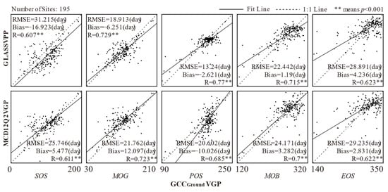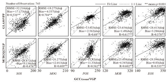 The multi-year mean phenology metrics were also calculated at each PhenoCam site and employed to validate the GLASS VPP and MCD12Q2 VGP dataset (Figure 8). Although both products demonstrated improved validation accuracy after accounting for interannual variability, the improvements were not substantial. The validation results revealed that GLASS VPP metrics exhibited slightly superior performance compared to MCD12Q2 VGP, particularly for the three metrics of MOG, POS, and MOB.