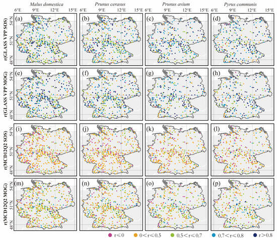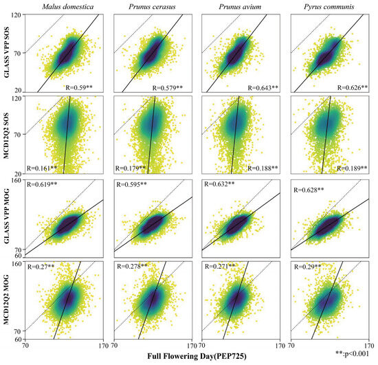 The GLASS VPP and MCD12Q2 VGP metrics were further validated against ground phenology records from the PEP725 network. Unlike the other two ground observation datasets, PEP725 provides direct plant phenology records. Given the inherent challenges of directly comparing satellite-derived phenology metrics and ground phenology records for absolute values, this study focused on assessing the consistency of the two datasets in spatial–temporal variations. Full flowering date records for four fruit trees (Malus domestica, Prunus cerasus, Prunus avium, and Pyrus communis) observed from 2001 to 2015 in Germany were used to evaluate the accuracy of SOS and MOG metrics from GLASS VPP and MCD12Q2 VGP. Figure 9 presents the validation results, demonstrating the superior consistency of VPP metrics with PEP725 phenology records compared to MCD12Q2 VGP. Correlation coefficients between GLASS VPP metrics and PEP725 records ranged from 0.58 to 0.64 for SOS and from 0.60 to 0.63 for MOG, significantly exceeding the range of 0.16 to 0.19 for SOS and 0.27 to 0.29 for MOG observed for MCD12Q2 VGP metrics. Moreover, the regression lines of GLASS VPP metrics against PEP725 records exhibited a much closer proximity to the 1:1 line, further underscoring their superior performance relative to the MCD12Q2 VGP dataset. Compared with SOS, the satellite-derived vegetation MOG was more consistent with the full flowering phenology records.