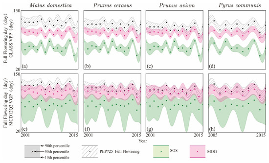 The annual changes in full flowering day, VPP, and VGP in Germany from 2001 to 2015. (a) Malus domestica and GLASS VPP, (b) Prunus cerasus and GLASS VPP, (c) Prunus avium and GLASS VPP, (d) Pyrus communis and GLASS VPP, (e) Malus domestica and MCD12Q2, (f) Prunus cerasus and MCD12Q2, (g) Prunus avium and MCD12Q2, (h) Pyrus communis and MCD12Q2.