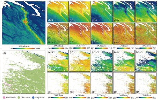 VPP metrics’ determination with DVM. Following the method proposed by Gonsamo et al. [83], the five key VPP metrics could be derived from the fitted DL function with these algorithms in Equations (4)–(8). SOS and EOS were identified as the transition dates of the first maximum value and last minimum value of third-order derivation of the fitted DL function, respectively. MOG and MOB were identified as the transition dates of the first maximum value and last minimum value of first-order derivation of the fitted DL function, respectively. POS was calculated as the mean of MOG and MOB.
