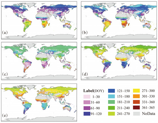 To assess the performance of the GLASS VPP product, we conducted an intercomparison with the satellite-derived vegetation greenness phenology (VGP) from the MCD12Q2 v6.1 product. The MCD12Q2 phenology metrics were derived from the Enhanced Vegetation Index (EVI) using a threshold-based method [62]. The MCD12Q2 VGP product has been widely utilized for determining long-term changes in vegetation phenology [78,79,80]. Since the definition of phenology parameters of MCD12Q2 differs from our VPP metrics, the corresponding relationships between the two products’ phenology metrics are outlined in Figure 2 and Table 2.