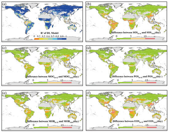 To ensure comparability with existing vegetation phenology studies while maintaining the accuracy of our metrics, we adopted commonly used thresholds of 10% and 50% for deriving the start/end and middle status of vegetation green-up and brown-down, respectively. While optimal Kp values might offer slightly improved performance, adhering to these common thresholds facilitates comparison with other studies. As indicated in Table 3, adjusting the Kp values to these standard thresholds had a minimal effect on the model’s performance, as measured by R2, bias, mean absolute deviation (MAD), and root mean square deviation (RMSD). Moreover, the consistency of phenology metrics derived from both methods remained within a two-day margin, indicating that our approach effectively balances accuracy and comparability.