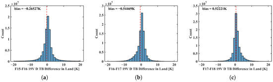 Histogram of brightness temperature differences at 18.7 (19.3) GHz between (a) DMSP-F15/SSMI and DMSP-F16/SSMIS, (b) DMSP-F16/SSMIS and DMSP-F17/SSMIS, and (c) DMSP-F17/SSMIS and DMSP-F18/SSMIS.