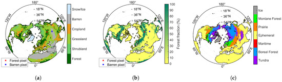 Spatial distribution of land cover types (a), forest fraction (b), and Sturm snow classification types (c) in the Northern Hemisphere.