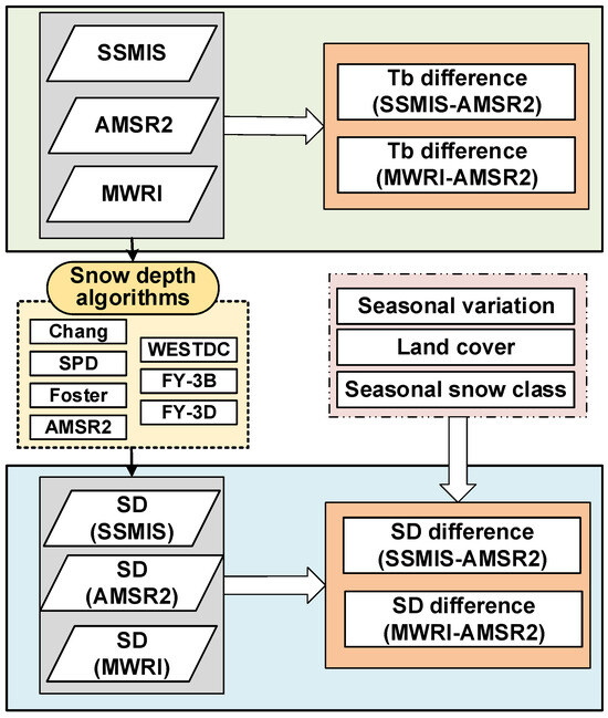 The structure of this paper is as follows: Section 2 introduces the data and methods; Section 3 analyzes the differences in brightness temperatures among different sensors and the sensitivity of snow depth retrieval algorithms to brightness temperature differences and the influence of seasonal snow variations, land cover types, and seasonal snow classifications on SD differences; Section 4 discusses the main findings; and Section 5 presents the conclusions of the study.