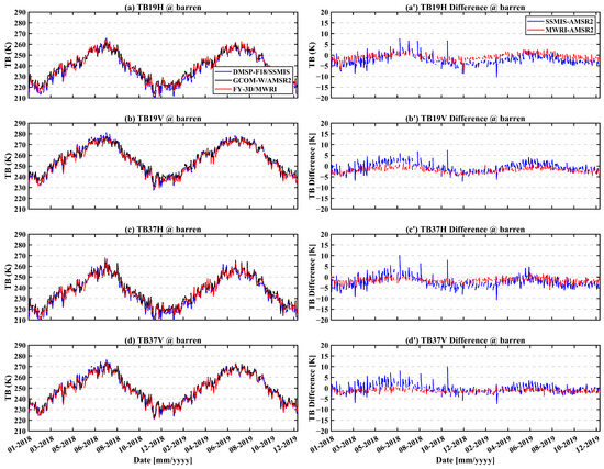 Time series of brightness temperature differences for barren pixel from 1 January 2018 to 31 December 2019. (a–d) are the brightness temperature at 18.7(19) GHz H-pol, 18.7(19) GHz V-pol, 36.5(37) GHz H-pol, and 36.5(37) GHz V-pol, respectively. (a′–d′) are the brightness temperature difference at the same frequency and pol.