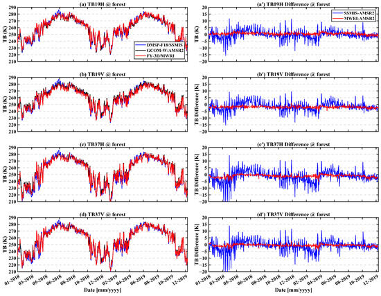 Time series of brightness temperature differences for forest pixel from 1 January 2018 to 31 December 2019. (a–d) are the brightness temperature at 18.7(19) GHz H-pol, 18.7(19) GHz V-pol, 36.5(37) GHz H-pol, and 36.5(37) GHz V-pol, respectively. (a′–d′) are the brightness temperature difference at the same frequency and pol.