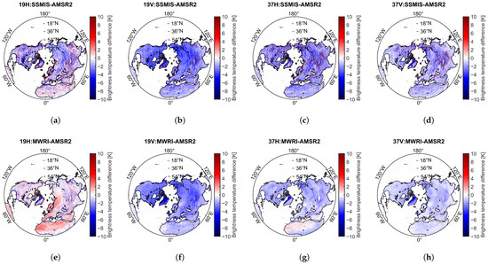 Spatial distribution of the annual mean brightness temperature differences for 2018–2019: (a–d) represent the differences between DMSP-F18/SSMIS and AMSR2, (e–h) correspond to the differences between FY-3D/MWRI and AMSR2. (a,e) correspond to 18.7(19) GHz H-pol, (b,f) to 18.7(19) GHz V-pol, (c,g) to 36.5(37) GHz H-pol, and (d,h) to 36.5(37) GHz V-pol.