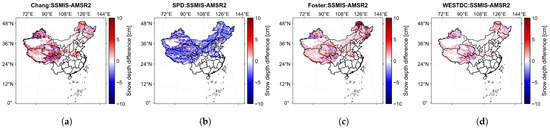 Spatial distribution of mean snow depth differences retrieved using (a) Chang, (b) SPD, (c) Foster, and (d) WESTDC algorithms estimated from DMSP-F18/SSMIS and AMSR2 brightness temperature data in China.