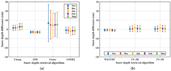 Figure 10 presents the monthly snow depth differences retrieved using MWRI and AMSR2 sensors. The results indicate that the SPD and WESTDC algorithms produce relatively stable snow depth differences across different months, with the standard deviation less than 3 cm. This stability may be attributed to the polarization difference approach of the SPD algorithm and the combined use of brightness temperature gradient and forest correction in the WESTDC algorithm [17,23]. In contrast, the Chang, AMSR2, FY-3B, and FY-3D algorithms show more consistent performance in November and December compared to January, February, and March, which might be explained by the shallower snowpack early in the season, leading to smaller retrieval differences. Conversely, the Foster algorithm exhibits more stable snow depth differences in January, February, and March than in November and December, which might be influenced by the forest [22]. Specifically, the snow cover is relatively thin in November and December, resulting in a larger proportion of exposed forest and a stronger forest influence, which increases retrieval errors. In contrast, the snow is relatively thick and more continuous in January and February, leading to more stable snow depth retrievals.