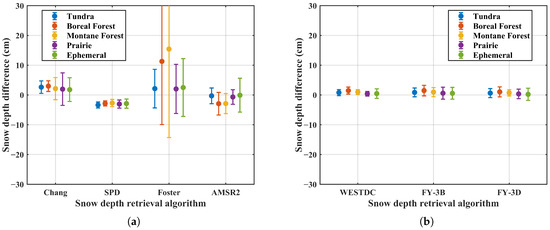 Snow depth differences retrieved using MWRI and AMSR2 sensors under different snow classifications: (a) global retrieval algorithms; (b) China algorithms.