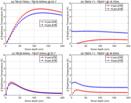 Figure 13 presents the simulated brightness temperature differences under different frequencies and observation angles. To isolate the effects of frequency and angle, other factors such as snow temperature were kept constant. Brightness temperatures were simulated using the snow microwave radiative transfer model DMRT, which has been widely validated and applied for snowpack studies [45,46]. The results show that the maximum brightness temperature difference between 18.7 GHz and 19.35 GHz reaches approximately 5 K for V-polarization and is slightly smaller for H-polarization. In comparison, the maximum brightness temperature difference between 36.5 GHz and 37.0 GHz is about 2 K. The effect of observation angle (53.1° versus 55°) is relatively modest, with maximum differences of ∼0.6 K for V-polarization and ∼1.8 K for H-polarization at 18.7 GHz, and less than 2 K at 36.5 GHz. These results indicate that brightness temperature differences due to frequency are more pronounced at lower frequencies, whereas angular effects are generally limited.