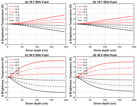 Overpass time mainly influences snow temperature, which is closely linked to air temperature. A 4 h difference in overpass time generally causes less than a 5 K change in air temperature, and given that snow temperature is highly sensitive to air temperature, it results in a similar variation in snow temperature [47]. To evaluate the potential impact of such variations on TBs, we tested whether ±1 K, ±3 K, and ±5 K changes in snow temperature could significantly affect the simulated signal. Simulations were conducted at 18.7 and 36.5 GHz with a 55° incidence angle. Figure 14 illustrates the influence of snow temperature differences on brightness temperature differences (ΔTB). The results indicate that at 18.7 GHz and snow depths ≤100 cm, a ±3 K change in snow temperature resulted in TB variations of less than 1 K, while a ±5 K change led to variations of less than 2 K. In contrast, at 36.5 GHz and snow depths ≤100 cm, the same snow temperature changes produced TB differences of up to 4 K and 6 K, respectively.