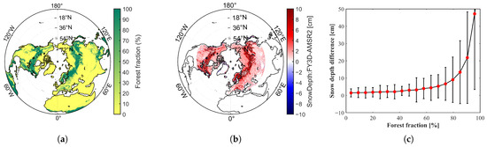 Distribution of (a) forest fraction, (b) snow depth differences retrieved using the Foster algorithm (FY-3D vs. AMSR2) in the Northern Hemisphere (>35°N), and (c) their relationship.