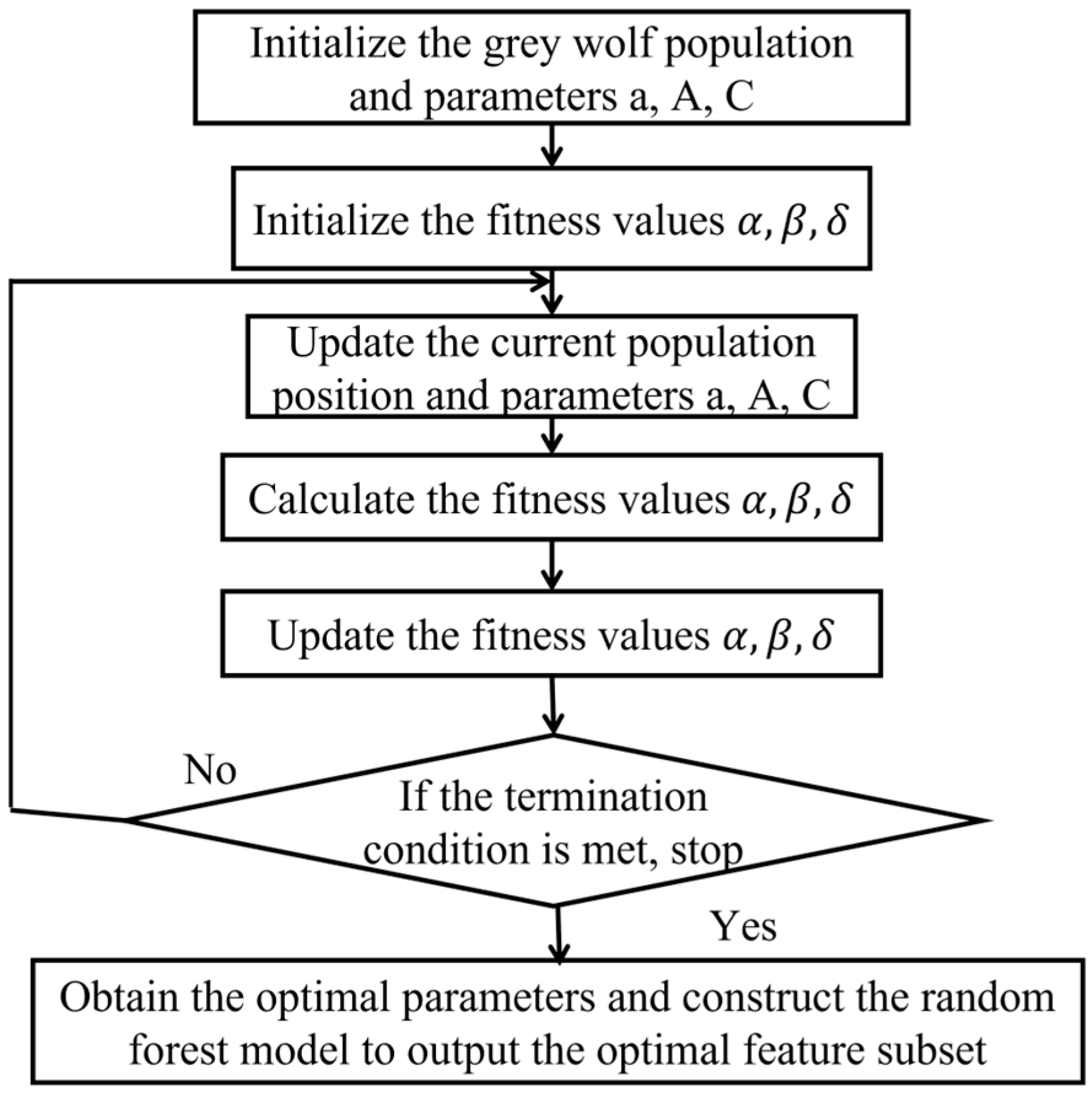 - Iterative update: Steps ② through ④ were repeated. In each iteration, the positions and fitness values of the and wolves were updated, and the gray wolf population’s positions were continuously optimized to progressively search for the global optimal feature subset.