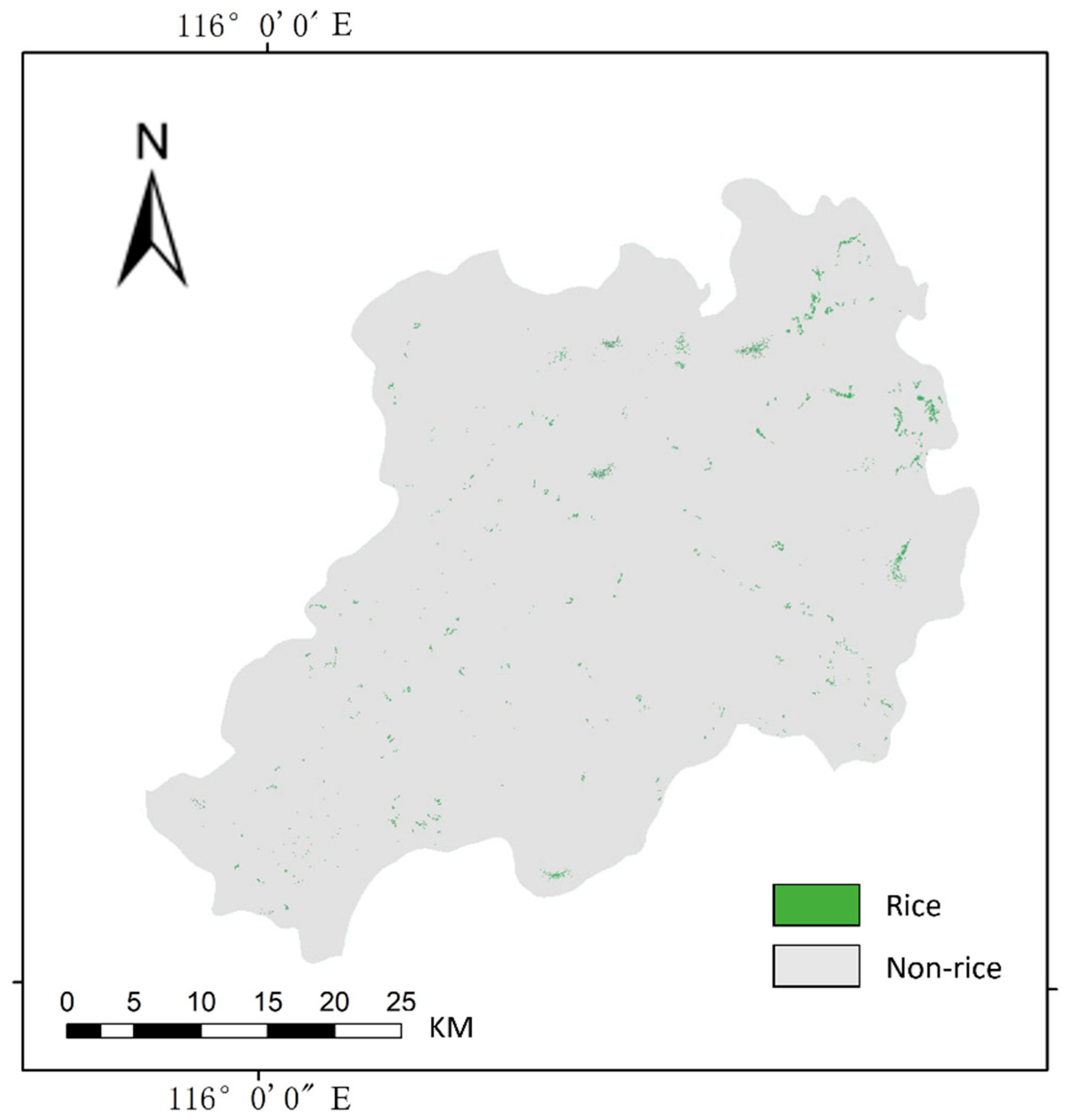 - Jing, W.; Huang, J.; Zhang, K.; Li, X.; She, B.; Wei, C.; Gao, J.; Song, X. Rice Fields Mapping in Fragmented Area Using Multi-Temporal HJ-1A/B CCD Images. Remote Sens. 2015, 7, 3467–3488. [Google Scholar]