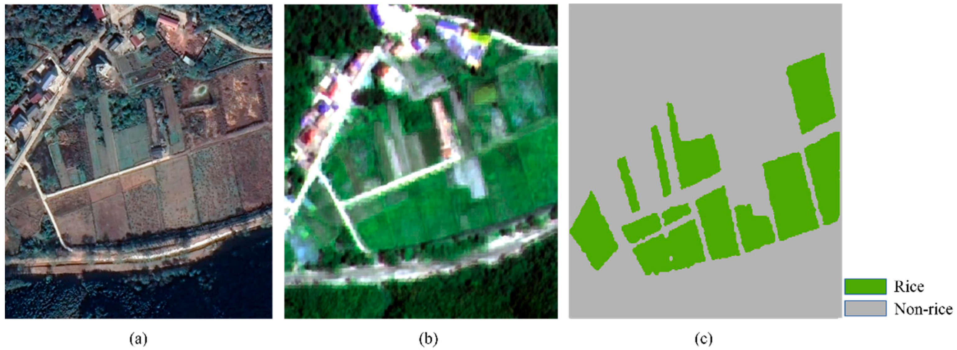 - Pang, J.; Zhang, R.; Yu, B.; Liao, M.; Lv, J.; Xie, L.; Li, S.; Zhan, J. Pixel-level rice planting information monitoring in Fujin City based on time-series SAR imagery. Int. J. Appl. Earth Obs. Geoinf. 2021, 104, 102551. [Google Scholar] [CrossRef]