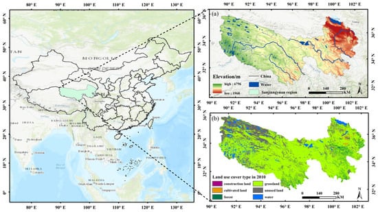 The Sanjiangyuan region between 31°33′–37°08′N and 89°25′–102°26′E, located in the central Tibetan Plateau, encompasses the Yangtze River, the Yellow River and the Lantsang [,,] (Figure 1). This ecologically significant area spans more than 360,000 km2 and exhibits characteristic plateau continental climate conditions, with mean annual temperatures averaging −4.8 °C and precipitation reaching approximately 484.85 mm based on multi-year observations. Geomorphologically, the region displays distinct elevation gradients, sloping from higher western areas to lower eastern zones, with grasslands constituting the predominant LU type. However, recent landscape changes, particularly urban expansion and vegetation degradation, have progressively diminished ES quality, creating substantial environmental challenges for this fragile alpine ecosystem.