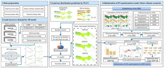 This research introduces a novel methodological framework that synergistically integrates the SD, PLUS, InVEST, and DBN models. The framework leveraged multi-source geospatial data to project LU configurations under various climate scenarios, evaluate historical ES, and determine optimal development pathways using spatial suitability analysis for ES enhancement (Figure 2).