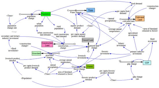 SD establishes an effective framework for simulating complex systems with interacting feedback mechanisms. This method quantitatively resolves nonlinear processes and time-varying relationships within such systems. This approach has gained prominence in LUCC simulations due to its capacity to incorporate socioeconomic drivers while maintaining methodological simplicity []. The effectiveness of SD in representing complex nonlinear relationships has led to widespread applications in urban system modeling and LUCC analysis.