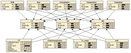 DBN was constructed using Netica 6.0 software, which required both structural and parametric learning. The network architecture was constructed by integrating established causal linkages between ES and their driving factors, incorporating insights from domain experts and the existing literature. Structural learning identified dependencies among nodes, while parametric learning quantified their conditional relationships [,]. ES are shaped by a combination of environmental, socioeconomic, and LU characteristics. The geographical and climatic conditions constitute key environmental determinants, whereas regional development levels represent important socioeconomic drivers. Consequently, we took CS, HQ, and WC as sub-nodes, and selected DEM, slope, precipitation, temperature, LU, potential evapotranspiration, road distance (to_roads), and GDP as parent nodes (Figure 4). The geometric interval method was employed to discretize the data above into three states: Low (L), Moderate (M), and High (H). The discretized states and their corresponding thresholds are detailed in Table S5. A total of 42,931 points data were uniformly generated across the study area. Using spatial overlay, the information at each node for both 2010 and 2020 was extracted. In total, 80% of the data were randomly selected as the training set, which was used to train the established DBN and fill the CPT. The remaining 20% of the data was used as the test set to verify the performance of the DBN.