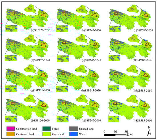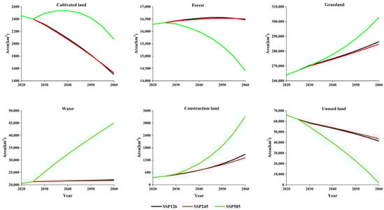 The overall trends of various land demand changes were roughly the same under different scenarios, but the change rates were various (Figure 5). The characteristics of the climate scenarios significantly influenced the evolution trends in LU with grassland, construction land, and water areas increasing across three scenarios. The SSP585 scenario showed the most substantial growth (38,968 km2, 2976.8 km2, and 24,424.1 km2, respectively), while SSP245 exhibited the smallest increments (20,946 km2, 963.9 km2, and 1184.4 km2, respectively). Cultivated and forest lands exhibited distinct change patterns across different scenarios. Under SSP585, cultivated land showed minimal degradation (381.3 km2), while forest decreased substantially (1880 km2). Conversely, SSP245 and SSP126 scenarios demonstrated rapid cultivated land reduction (924.4 km2 and 951.5 km2, respectively) accompanied by modest forest expansion (217.2 km2 and 182.7 km2, respectively). Unused land exhibited consistent declines across all climate scenarios, with the most substantial reduction (64,107.8 km2) under SSP585. The SSP245 and SSP126 scenarios showed comparable decreases of 22,386.8 km2 and 24,459.1 km2, respectively. These results demonstrate that the SSP585 scenario induced markedly more severe land degradation compared to both the SSP245 and SSP126 scenarios.