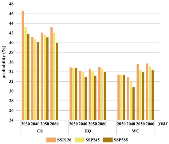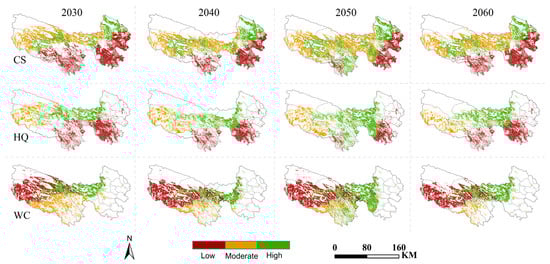 Projections revealed significant disparities in ES across the three scenarios in the Sanjiangyuan Region (Figure 8). The SSP126 scenario yielded the most favorable ES outcomes, followed by SSP245, while SSP585 resulted in the least favorable performance. Under SSP126, ES exhibited a nonlinear trend, characterized by an initial decline followed by partial recovery, although 2060 levels remained below baseline values. In contrast, ES changes under SSP245 and SSP585 were relatively stable over time. However, by 2060, CS and HQ declined across these scenarios, whereas WC improved. Overall, SSP126 emerged as the optimal scenario for sustainable ES development, balancing ecological conservation with socioeconomic progress.