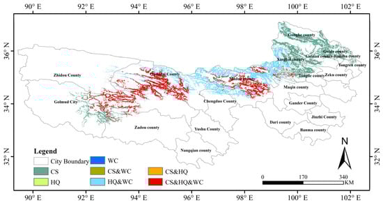 The optimization analysis revealed significant spatial overlap among regions exhibiting high-level performance across multiple ES (Figure 10). These overlapping zones included areas where CS and HQ co-occurred at optimal levels, CS and WC jointly reached peak performance, HQ and WC simultaneously achieved high states, and all three ES collectively attained maximum development. Notably, the co-optimized areas for CS and HQ coincided precisely with those for CS and WC, as well as the tripartite optimization zones encompassing CS, HQ, and WC. These regions possessed optimal environmental characteristics and LU patterns that supported the integrated development of multiple ES. River confluence zones with gentle slopes, abundant rainfall, and moderate temperatures provided particularly favorable conditions for enhancing all three ES simultaneously. The most productive areas were located in specific geographic locations: western Qumarleb County, western Xinghai County, eastern Golmud City, central Maduo County, and central Zhidoi County.