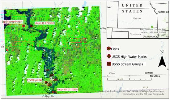 The study area focuses on the flood event that occurred along the Verdigris River in southeastern Kansas, United States, captured by the Sentinel-2 image at noon on 27 May 2019 (Figure 1). It is delimited between the cities of Coffeyville and Independence by two USGS gauges in the area, which provide discharge and stage observations for building a HEC-RAS 2D model as the reference inundation depth map for the event. The USGS gauges for Independence and Coffeyville are identified by station IDs of 07170500 and 07170990, respectively. For HEC-RAS model calibration, eight high-water marks from the USGS Flood Event Viewer were selected over the study area. This study area was selected due to the availability of relatively cloud-free satellite imagery and USGS gauge and high-water mark data, along with the fact that this area is particularly flood-prone, with another similar flood event occurring along the same stretch of river in July of 2007 [25].
