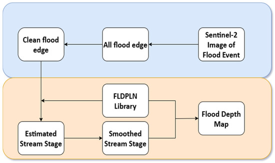 The FLDSensing methodology consists of two main components: (1) identifying clean water-land edge pixels; (2) estimating stream stage using the edge pixels and generating an inundation depth map using the stage and an FLDPLN library (Figure 2). The method first generates a remote sensing-based flood inundation extent map and extracts the water-edge pixels from it. These edge pixels are then filtered (clean flood edge pixels) using a set of masking criteria such as cloud cover, land cover, and slope. Stream stage is then estimated, smoothed, and used to generate an inundation depth map using an FLDPLN library, which stores flood inundation information on how each floodplain location can be flooded by floodwater from multiple stream locations.