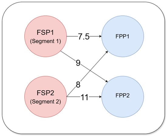 Given the many-to-many nature of the FSP-FPP flooding relationship, an edge FPP can potentially be flooded by multiple FSPs. This can lead to many DOFs depending on which FSPs are selected to flood the FPP. FLDSensing iterates through all possible DOF combinations for all edge FPPs and selects the combination that gives the least total flood depth at those FPPs [31] (pp. 48–60). In Figure 4, FSP1 and FSP2 can inundate both edge pixels FPP1 and FPP2. The DTFs for FSP1 to inundate FPP1 and FPP2 are 7.5 and 9, respectively, so the DOF at FSP1 can be 7.5 or 9. The DTFs for FSP2 to inundate FPP1 and FPP2 are 8 and 11, respectively, so the DOF at FSP2 could be 8 or 11. Table 1 shows all the possible DOF combinations at the FSPs and their resulting flood depths at the two FPPs. Case 3, with the DOFs of 9 and 8 at FSP1 and FSP2, respectively, is the best combination, as it produces the least total flood depth of 1.5 for both FPPs. As a result, the DOFs at FSP1 and FSP2 are assigned to 9 and 8, respectively. Case 1 is discarded due to the negative flood depth at FPP2. If no valid combination is found, the corresponding clean-edge pixels are excluded from further consideration.