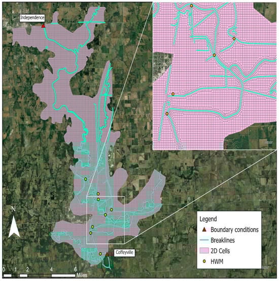 The model domain was discretized into 40,982 computational cells with an adaptive mesh, consisting of a base resolution of 75 × 75 m and refinement to 12 × 12 m in areas requiring detailed representation of hydraulic features. This flexible mesh adjusts cell sizes according to breaklines, ensuring that the main Verdigris River channel is represented by at least four cells across its width. Breaklines were introduced to preserve topographic controls along levees, embankments, and channel centerlines (Figure 5). Terrain data used was derived from the 5 m LiDAR DEM. The DEM was hydro-conditioned to ensure channel connectivity and account for bridges and other man-made structures. Boundary conditions were defined using hourly discharge at the USGS gauge 07170500 (upstream) and water surface elevation at the USGS gauge 07170990 (downstream) (Figure 6), with data retrieved from the USGS online web service. The total computational time window modeled was between 14 and 30 May 2019.