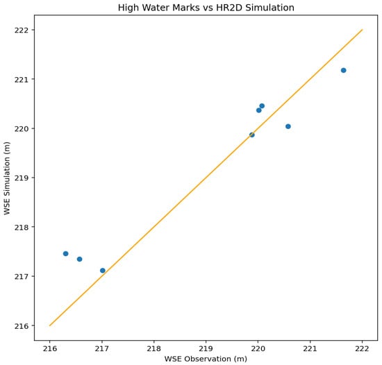 Comparison of high-water marks against HEC-RAS 2D simulation for calibration of model Manning roughness values presented in Table 3.