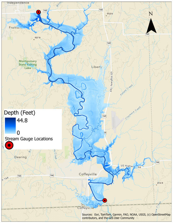 Flood dynamics along the Verdigris River between USGS gauge 07170500 and USGS gauge 07170990 were simulated using a two-dimensional HEC-RAS model (version 6.5) in 2D configuration (HR2D). The governing equations are based on the shallow-water equations and solved through the Eulerian–Lagrangian Method (SWE–ELM). The modeled river reach extends approximately 60 km in length, covering a total flood domain of 190 km2. A 48 h warm-up period was included to stabilize the initial hydraulic conditions of the model. The turbulence model was set to conservative, with longitudinal and transverse mixing coefficients assigned to default values, as no field velocity measurements were available for calibration. A fixed computational time step of 30 s was adopted, with adaptive adjustment allowed between 15 and 60 s depending on the Courant number to maintain numerical stability. The HR2D model was defined and built using the System International (metric system) units. Results generated are exported to the United States unit systems.