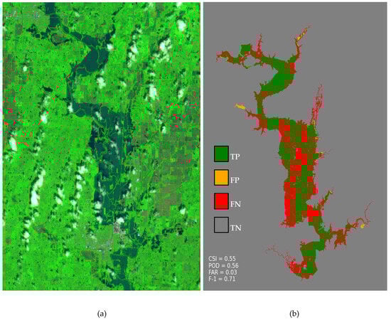 (a) Sentinel-2 SWIR image (RGB bands: B12, B8A, B4). (b) Agreement map between Sentinel-2 and HEC-RAS 2D benchmark, where green = True Positive (TP) (correct inundation), yellow = False Positive (FP) (incorrect inundation), red = False Negative (FN) (incorrect non-inundation), gray = True Negative (TN) (correct non-inundation).