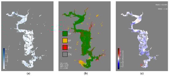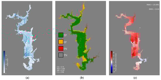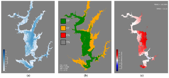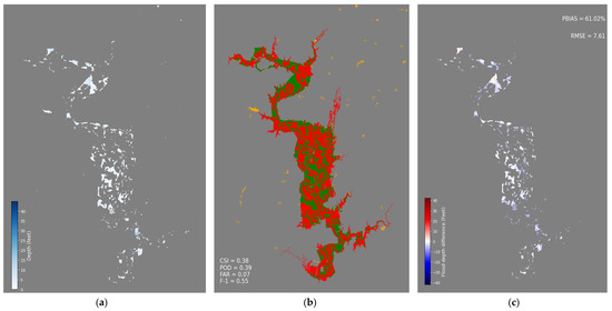 Figure 9b shows the poor performance of using a purely remote sensing-based FIM with CSI, POD, FAR, and F1 having values of 0.55, 0.56, 0.03, and 0.71, respectively. This is caused by clouds and vegetation canopy, which obscure the floodwater from the Sentinel-2’s optical sensor and significantly underestimate the flood inundation extent. In addition, remote sensing FIM cannot estimate flood depth, which makes the map less valuable for emergency responders and decision-makers.