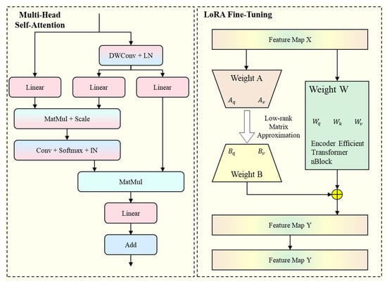 The function of multi-head self-attention within the ResT is to divide the features in the image and process them concurrently to ascertain the spatial relationships of the captured features. The structure of the multi-head self-attention is shown in Figure 2. In this study, we introduce the LoRA fine-tuning to the multi-head self-attention mechanism part of the ResT backbone to improve the precision of semantic segmentation on remote sense images. As illustrated in Figure 2, the LoRA fine-tuning strategy freezes the weight matrix during the model update process to remain the predicted result of our LMVMamba model. The original weight matrix is decomposed into two low-rank constituent matrices A and B. During the training phase, the model is required to only train these two smaller, low-rank matrices in order to enhance the model’s accuracy while preserving the original performance. Specifically, the input feature map X generates the query (Q), key (K), and value (V) through linear layers. Subsequently, the LoRA layer adjusts the low-rank weight matrices and , based on the parameters Q, K and V. In the original linear variation layer, the weight matrix and the input features are transformed according to the following linear function to obtain the output: