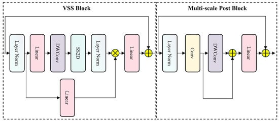 Structure of proposed VSS block and Multi-Scale Post Block.