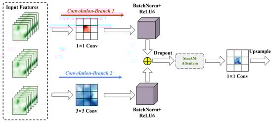 where the and are denote convolution with kernel size 1 and 3, respectively. is the sum of the two branches’ output. To further enhance the feature representation capability of the model, the SimAM attention mechanism is introduced in the module. The SimAM can dynamically adjust the importance of each channel and emphasize key feature information by the energy function without adding additional parameters. The structure of SimAM is illustrated in Figure 5.
