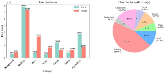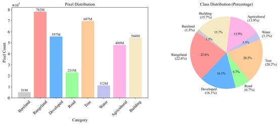 OpenEarthMap: The OpenEarthMap dataset comprises 5000 images captured from arial photography and satellite imagery, encompassing 97 regions across 44 nations on six continents. The resolution of the images in this dataset is 0.25–0.5 m. Since all images in the dataset have a 1:1 aspect ratio but differ in size, we uniformly resized them to 1024 × 1024 pixels. The dataset contains eight land-use categories: bareland, rangeland, developed space, road, tree, water, agriculture land and building. The total count and percentage of pixels in each category in the dataset is shown in Figure 6. For the OpenEarthMap dataset, we set the dataset in accordance with the stipulated guidelines. The number of images constituting the training, validation, and testing subset is 3500, 500 and 1500, respectively.