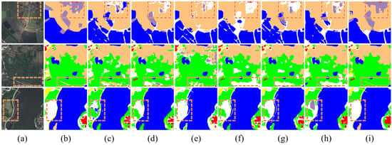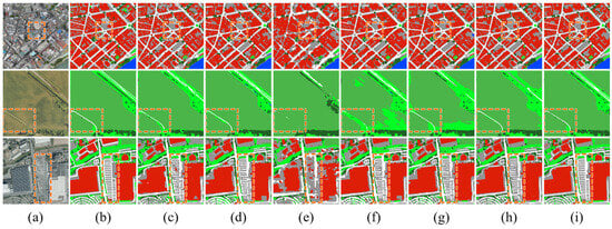 In this study, we utilize mean intersection over union (mIoU), mean F1 score (mF1), and overall accuracy (OA) as our evaluation metrics for remote sensing semantic segmentation, employing these measures to assess the performance of our models across a range of scenarios. All the evaluation metrics are shown in Table 2. In Table 2, refers to the number of correctly identified positive samples in category . refers to the number of incorrectly negative samples in category . refers to the number of positive samples that were missed.