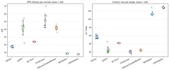 To evaluate the difference in inference speed between the LMVMamba model and other models, experiments were designed with the focus being on frames per second (FPS) and latency. In the course of these experiments, ten separate inferences were performed for each model in order to obtain the FPS and latency for each iteration. The mean values along with the standard deviations were then calculated to evaluate the stability of each model’s prediction speed during inference.