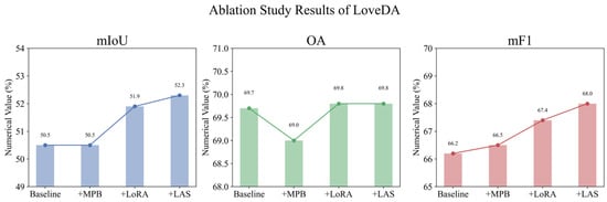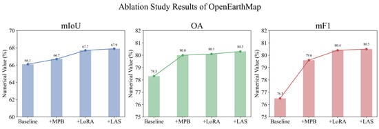 In this study, the effectiveness of each proposed improvement modules was evaluated through the conduction of ablation experiments on the OpenEarthMap dataset and the LoveDA dataset. In the ablation experiments, we added MPB, LoRA, and LAS modules to the baseline model gradually and performed experimental validation.