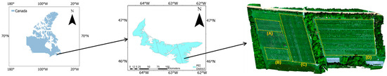 The UAV multispectral images were acquired over an apple orchard in Souris, Prince Edward Island, Canada (Latitude 46.44633N, Longitude 62.08151W) (Figure 1). The surveyed orchard included 18 different apple tree cultivars, such as Cortland, Gala, Sunrise, Virginia Gold, Honey Gold, Jona Gold, Russet, Spygold, and a selection of mixed varieties, leading to a variety of crown shapes and sizes. The trees are in a wide range of ages, from very young to mature. The multispectral camera was mounted on a DJI Matrice 100 multirotor UAV platform, classified as a light unmanned aerial vehicle. This multirotor configuration enabled stable, low-altitude flights and flexible maneuvering, which were well-suited for orchard-scale image acquisition. The UAV images were captured during the summer of 2018 using a MicaSense multispectral camera (MicaSense Inc., Seattle, DC, USA) equipped with five sensors including Blue (central wavelength: 475 nm), Green (560 nm), Red (668 nm), Red-Edge (717 nm), and Near-Infrared (840 nm). The camera was mounted on a UAV designed by A&L Canada (London, ON, Canada), weighing just under 2 kg. Mission planning software was used to coordinate the UAV and camera operations, enabling flights at 100 m with 70% overlap between adjacent images. The ground sampling distance (GSD) of the image is 7 cm.